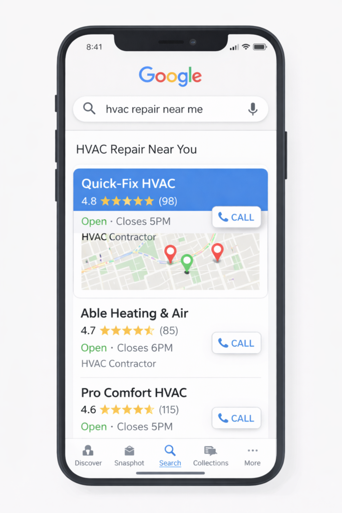 If someone searches “HVAC repair near me” or “emergency plumber [your city]” and you’re not showing up, you’re leaving money on the table every single day.
